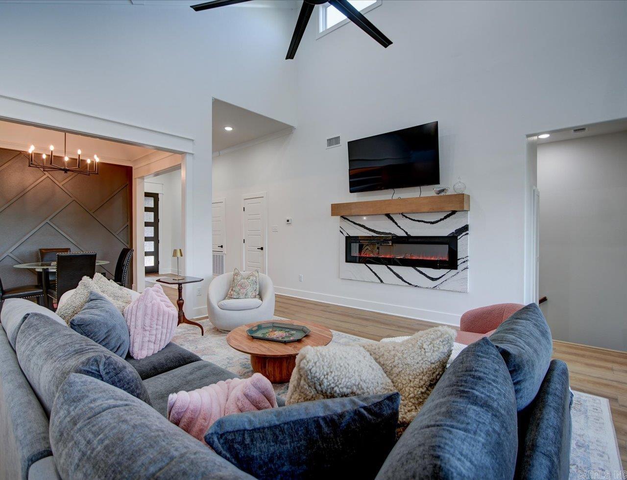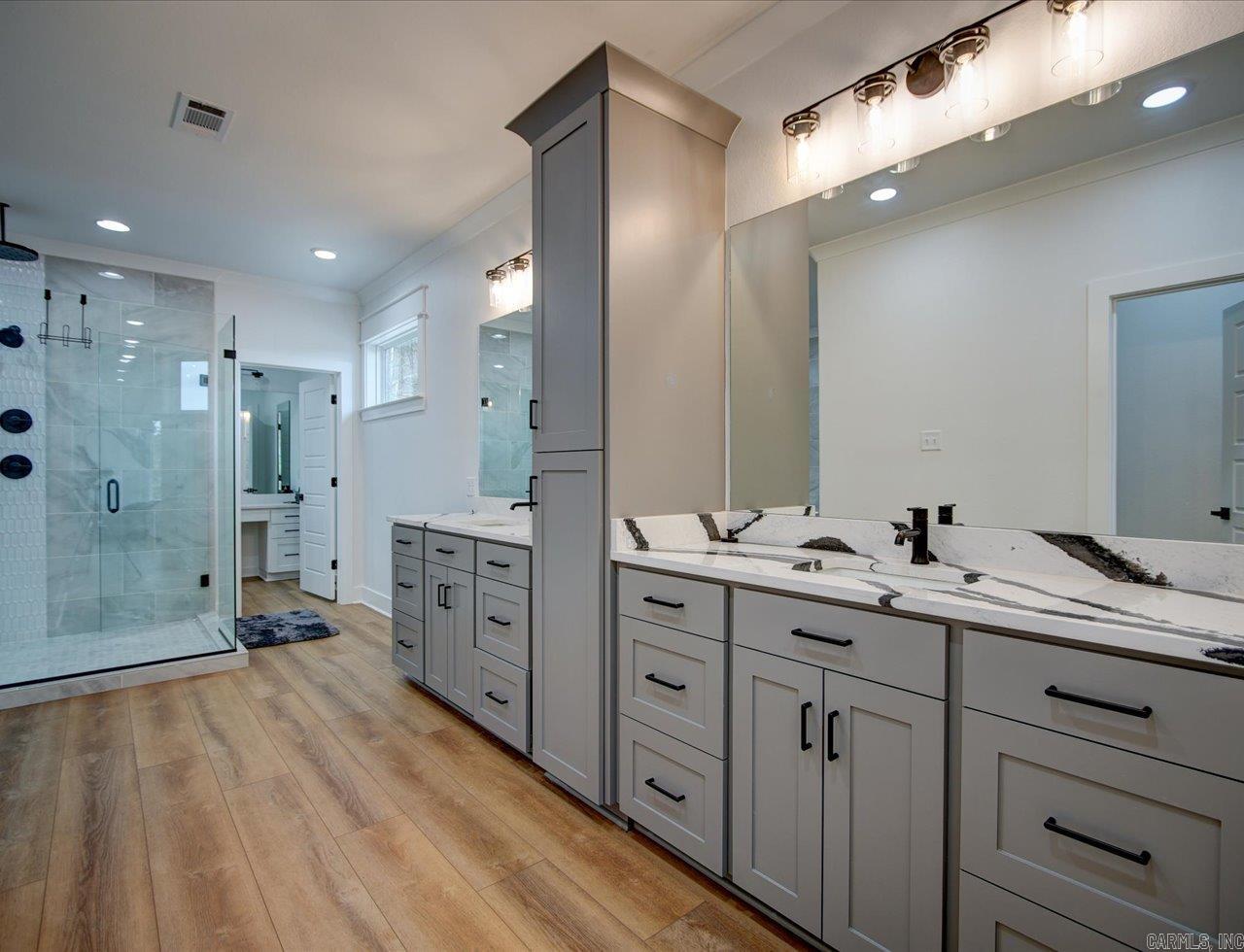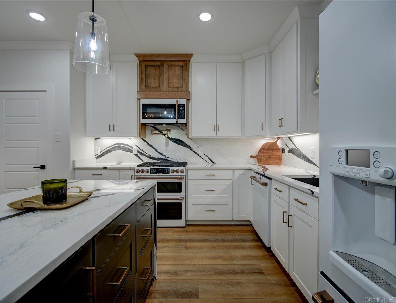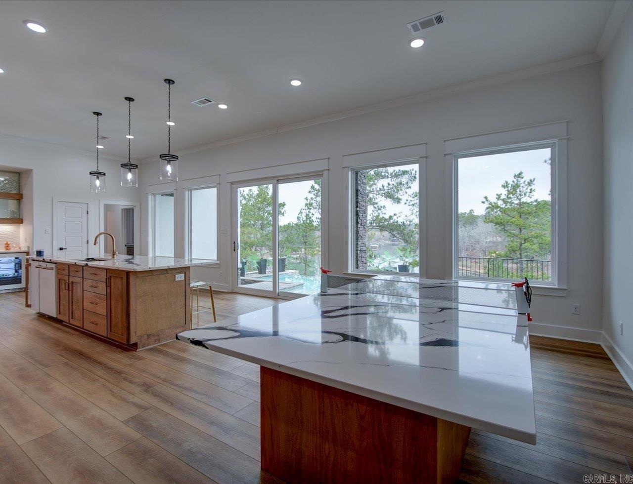 Luxury Lakefront Living Newer Construction on Lake Hamilton Built in 2023 and tucked away with no through traffic, this exceptional Lake Hamilton lakefront home offers modern design, flexible living spaces, and year-round water access in a peaceful setting. With 6 bedrooms, 3 full baths, 2 half baths, and three laundry areas, the thoughtfully designed layout provides comfort and convenience for everyday living and entertaining. Both levels feature full kitchens with quartz countertops, Café appliances, and refined finishes, making the home ideal for multi-level living or hosting guests. Expansive windows throughout capture sweeping lake views and fill the interiors with natural light, while multiple living areas create space to gather or unwind. An on-demand generator adds an extra layer of reliability and comfort. Outdoor living is a standout, with a gunite infinity pool overlooking the water and a private single-bay boat dock equipped with a trolley system for easy lake access. Whether boating, fishing, or enjoying the scenery, the setting delivers a true Lake Hamilton lifestyle. Combining newer construction, luxury features, and a serene waterfront location, this property