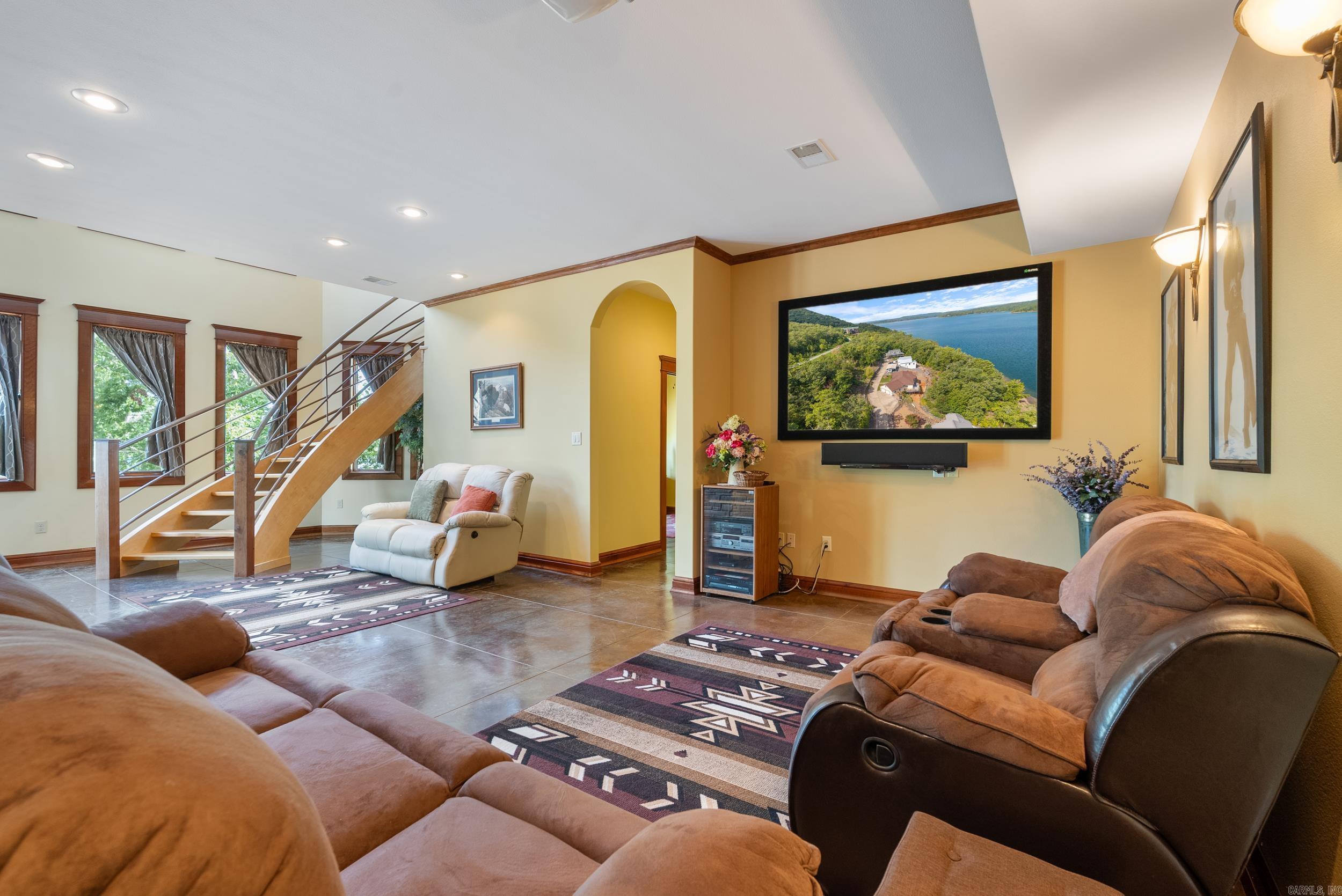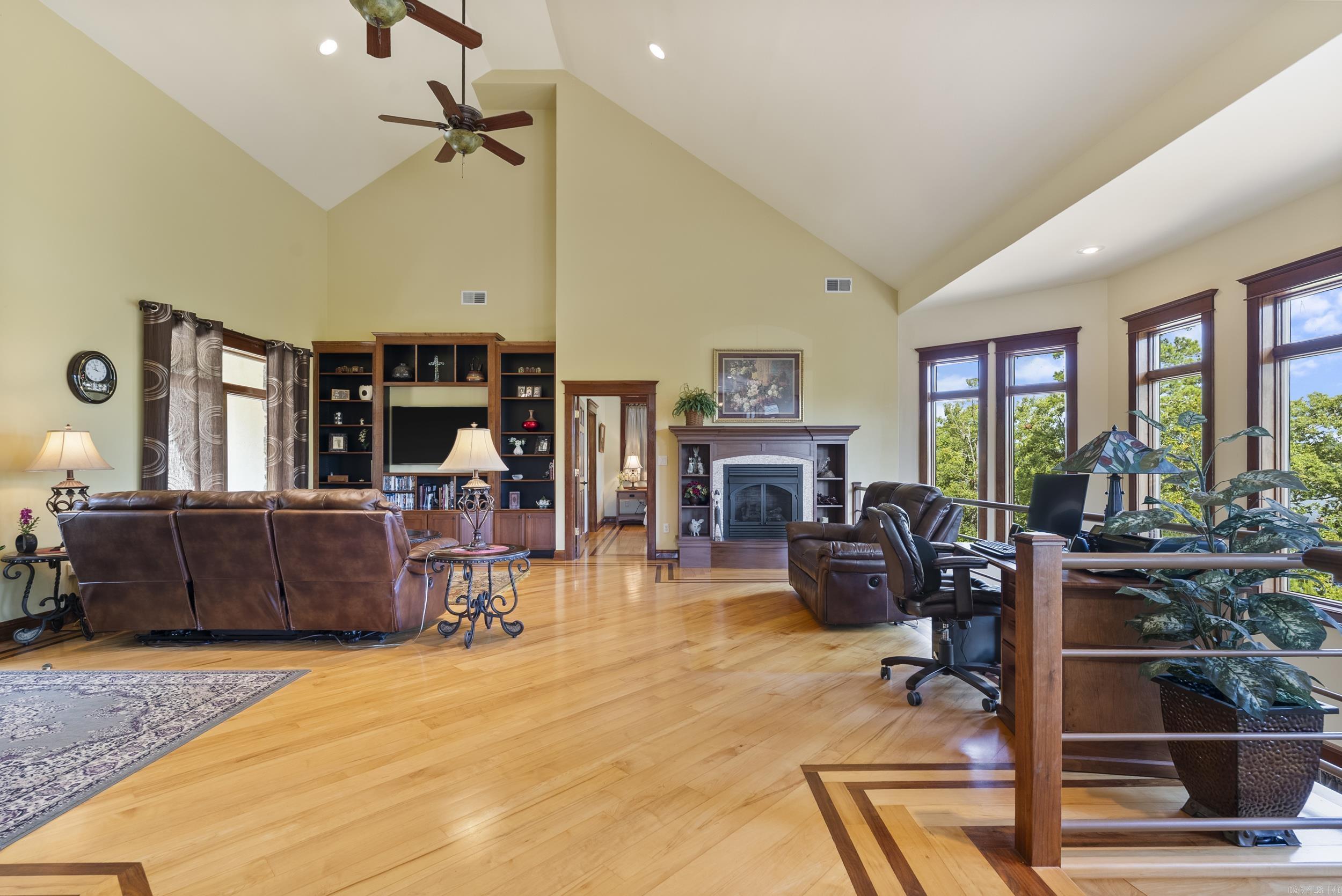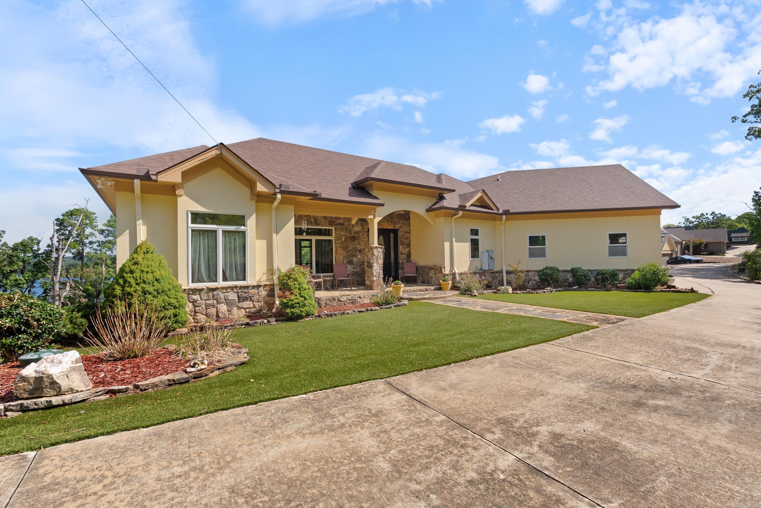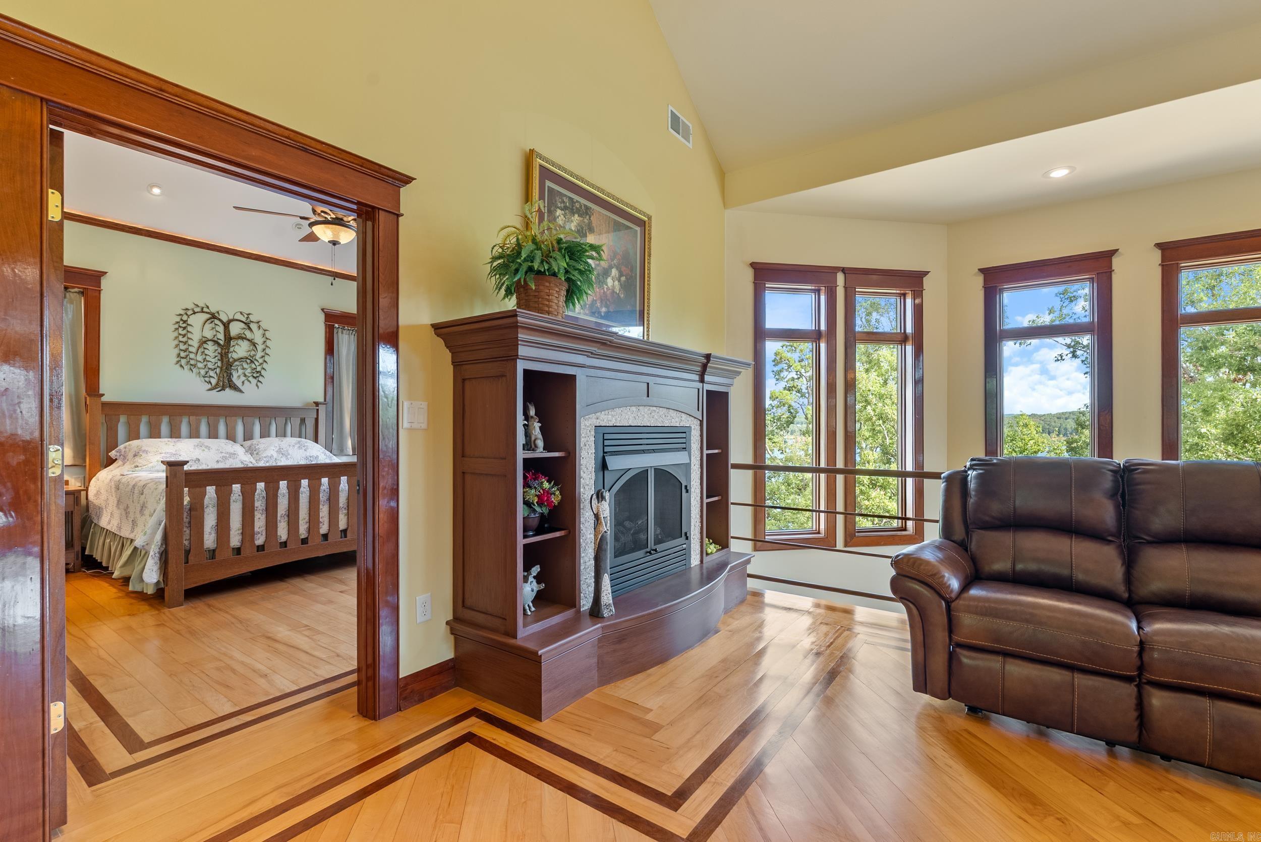 Welcome to your dream retreat on beautiful Greers Ferry Lake! This luxurious lakefront home is full of warmth, character, & high-end finishes—from stunning in-laid floors to customized cherry wood trim, cabinets and beautiful doors. The open floor plan offers bright, spacious living with breathtaking lake views from nearly every room—perfect for relaxing or entertaining. A grand, sweeping staircase connects two inviting living areas, each with its own cozy fireplace. Enjoy movie nights in the dedicated theater area & host friends & family with ease in multiple entertainment spaces. The walk-out basement opens to a large patio—ideal for lakeside gatherings and sunset views. A gourmet kitchen with generous pantry makes entertaining effortless, while the built-in tornado and storage room adds extra peace of mind. For added convenience, nearby boat launch & storage facilities make enjoying the lake even easier—bring your boat, jet skis, & water toys with confidence. Located twenty minutes from Sugar Loaf park & twenty minutes from Highway 65. 2x6 Construction, spray foam insulation, New Roof in 2025, newer DW&Fridge, oversized 2 car garage (700+sqft) Lake living at its finest!