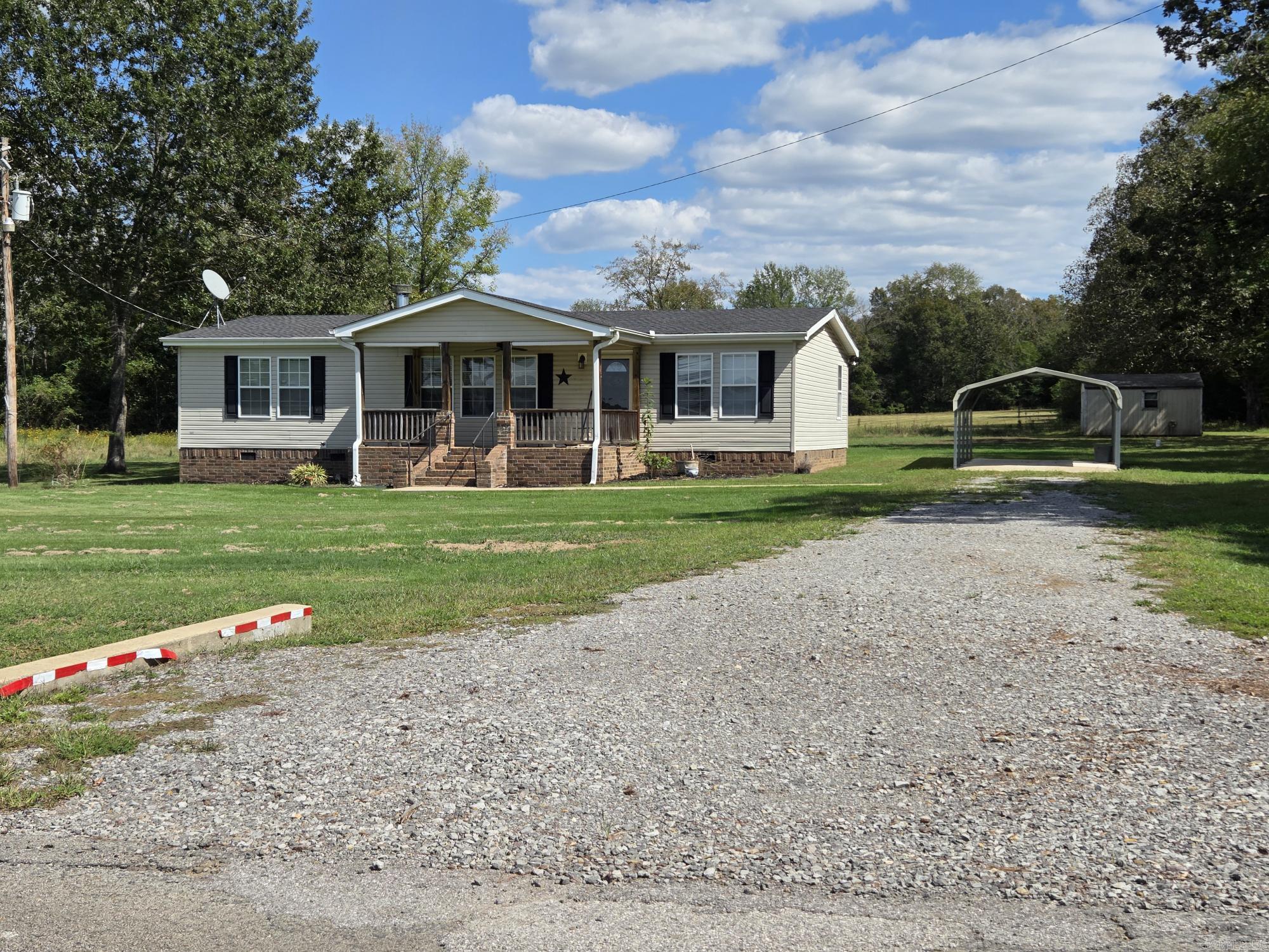 Very nice double wide on permanent foundation with 6" sheetrock walls & ceilings on 2 acres just a few miles northwest of Searcy. Nice level land, 2 car detached carport, storage building, large back deck & covered front porch with swing. Inside you will find a foyer, open floorplan with fireplace in the living room & a kitchen with a long breakfast bar & pantry. The primary bedroom has an attached spacious bathroom with a garden tub, standup shower, double sinks that has an exterior back door. The added sunroom has a Mini split & wrap around windows for relaxing but could be used as a game room, 4th bedroom, office or den. If you do not need the extra acre to the left, sell it or have a relative or friend build on it. See agent remarks.